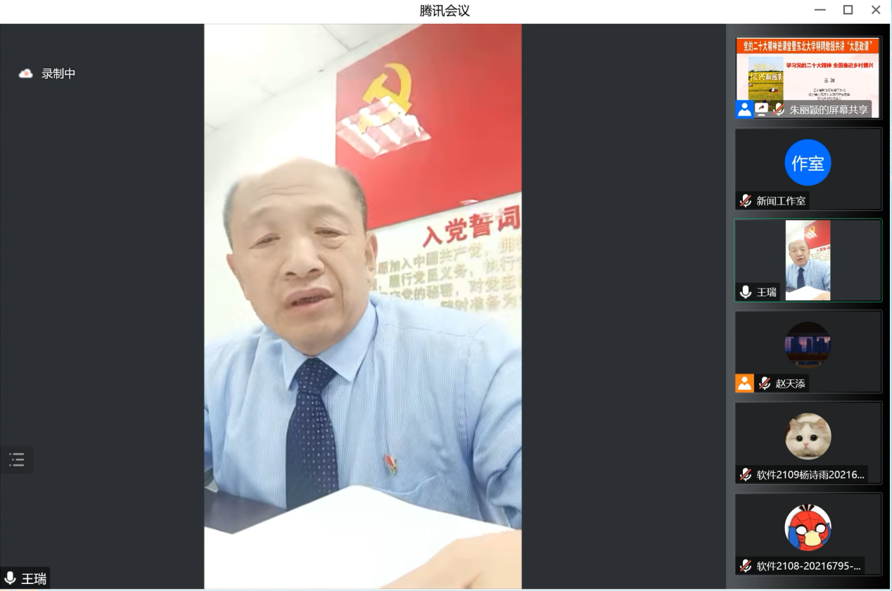 12月8日,动漫h 特聘教授、原辽宁省财政厅驻陡岭村工作队队长兼村党支部第一书记王瑞应邀走进“大思政课”云端课堂,结合自身乡村振兴工作实际,为动漫h 学生进行了题为《学习党的二十大精神 全面推进乡村振兴》的思政课教学。