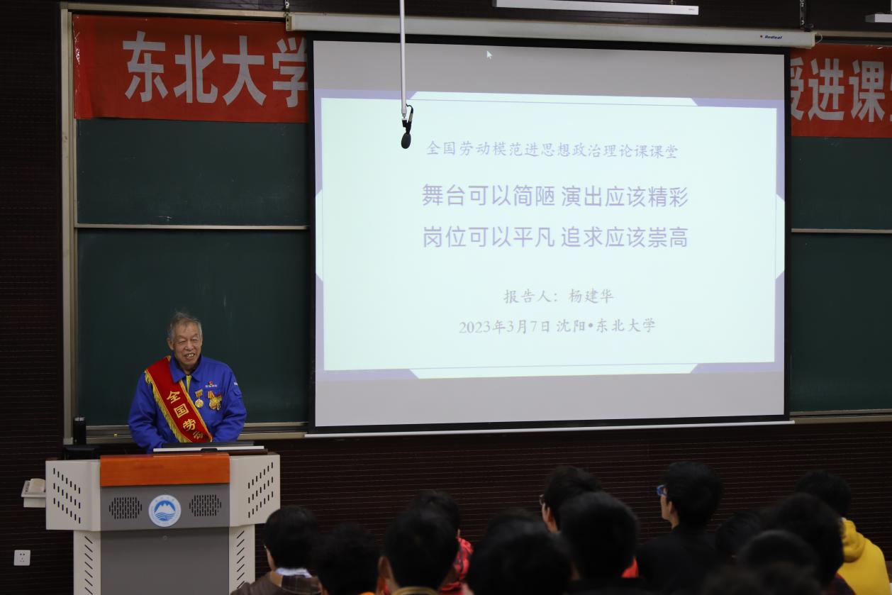 为深入学习宣传贯彻党的二十大精神,大力弘扬劳模精神、劳动精神、工匠精神,引导广大青年学生从中汲取信仰力量,3月7日,全国劳动模范、沈阳鼓风机集团教授级首席工人专家、动漫h 思想政治理论课特聘教授杨建华应邀走进动漫h “中国近现代史纲要”课堂,以“舞台可以简陋 演出应该精彩 岗位可以平凡 追求应该崇高”为题,为动漫h 学生讲授了一场生动的思政课。