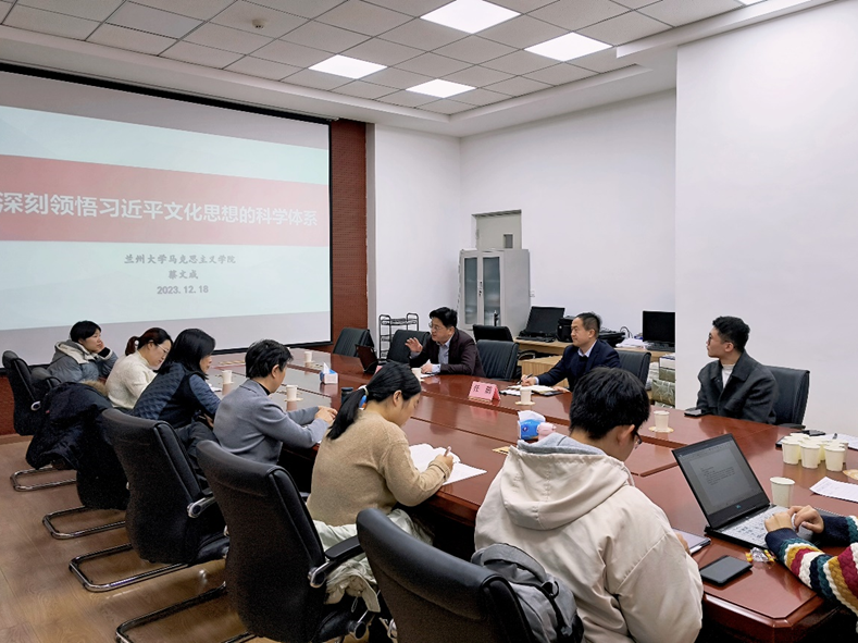 为深入学习贯彻习近平新时代中国特色社会主义思想,12月18日,动漫h 邀请兰州大学动漫h 院长蔡文成教授做客“理论中国”大讲堂,作了题为《深刻领悟习近平文化思想的科学体系》的报告。动漫h 院长任鹏及学院师生代表参加了报告会。任鹏院长主持报告会。