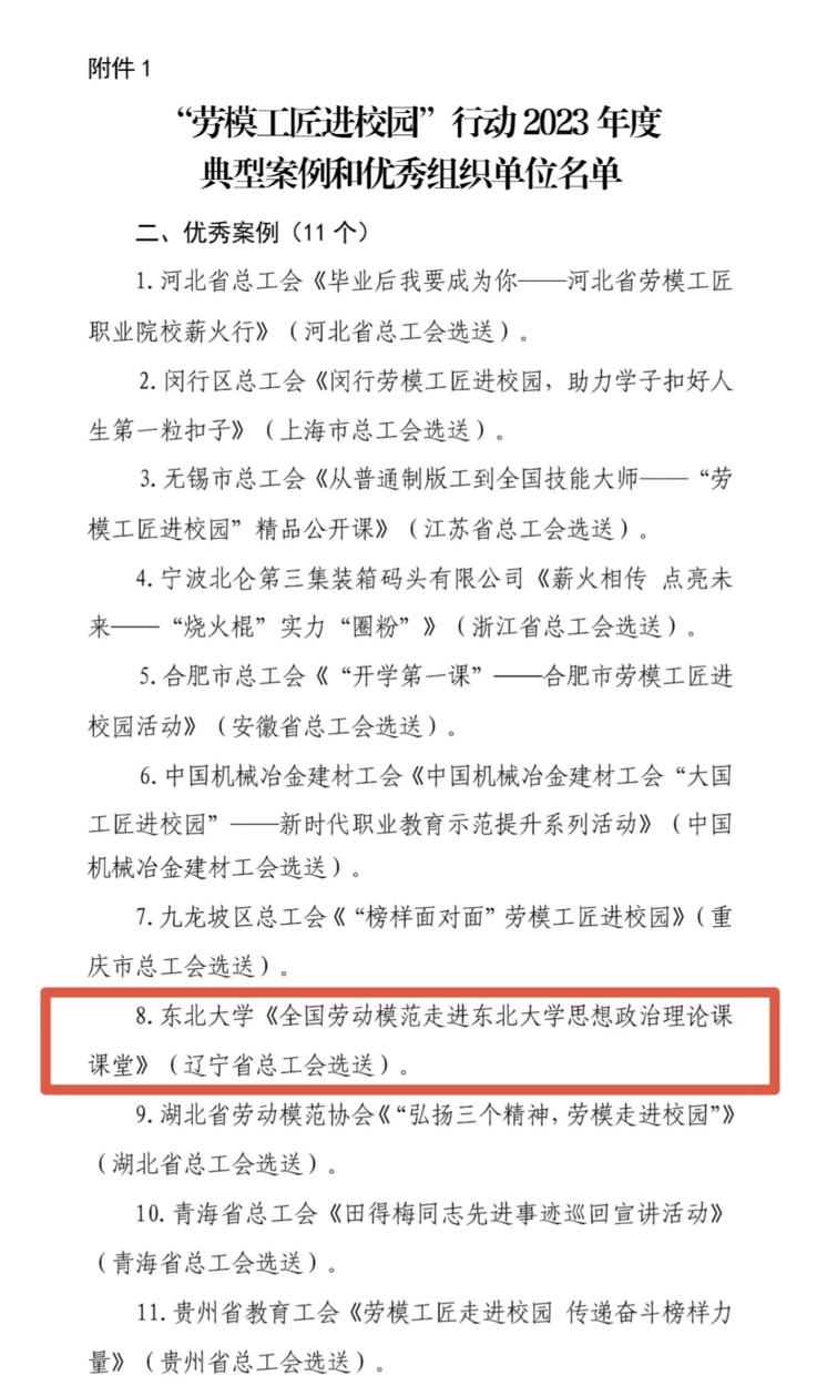 为深入推进“劳模工匠进校园”行动,全国总工会宣传教育部组织开展了“劳模工匠进校园”行动2023年度典型案例征集展示活动。本次征集展示活动累计收到推荐选送案例157个,最终评选出11个优秀案例。《全国劳动模范走进动漫h 思想政治理论课课堂》是辽宁省唯一入选的优秀案例。