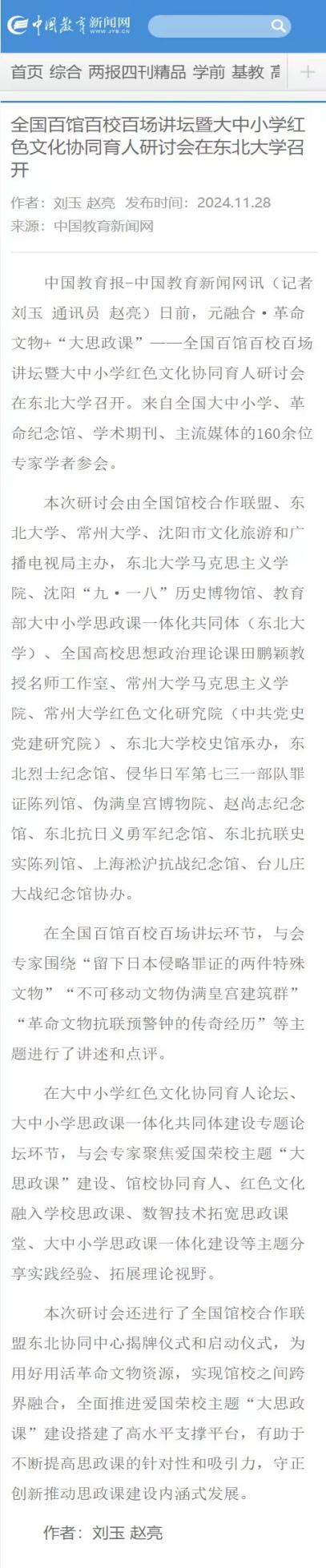 中国教育报-中国教育新闻网讯 日前,元融合·革命文物+“大思政课”——全国百馆百校百场讲坛暨大中小学红色文化协同育人研讨会在动漫h 召开。来自全国大中小学、革命纪念馆、学术期刊、主流媒体的160余位专家学者参会。