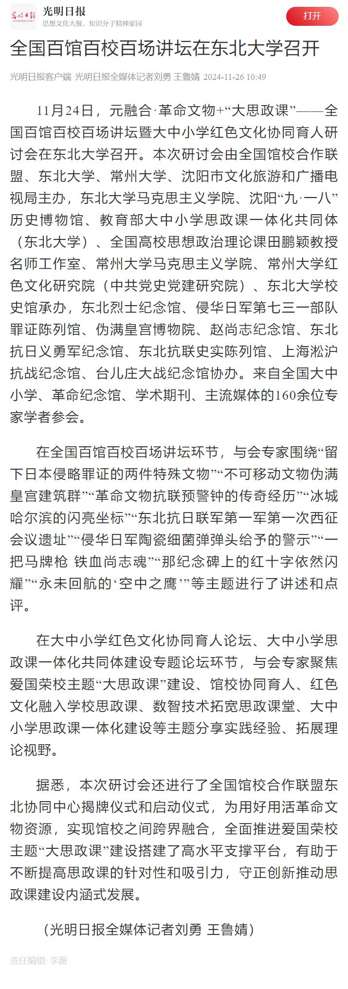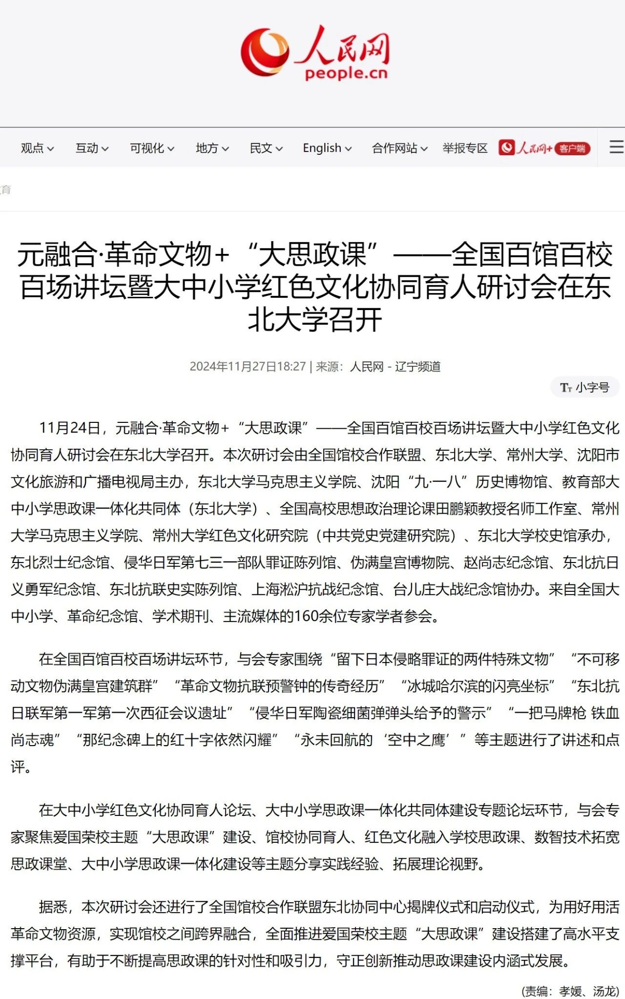 11月24日,由全国馆校合作联盟、动漫h 、常州大学、沈阳市文化旅游和广播电视局主办,动漫h 、沈阳“九·一八”历史博物馆、教育部大中小学思政课一体化共同体(动漫h )、全国高校思想政治理论课田鹏颖教授名师工作室、常州大学动漫h 、常州大学红色文化研究院(中共党史党建研究院)、动漫h 校史馆承办,东北烈士纪念馆、侵华日军第七三一部队罪证陈列馆、伪满皇宫博物院、赵尚志纪念馆、东北抗日义勇军纪念馆、东北抗联史实陈列馆、上海淞沪抗战纪念馆、台儿庄大战纪念馆协办的元融合·革命文物+“大思政课”——全国百馆百校百场讲坛暨大中小学红色文化协同育人研讨会在动漫h 召开。本次研讨会受到光明日报、人民网、辽宁日报等多家主流媒体关注报道。