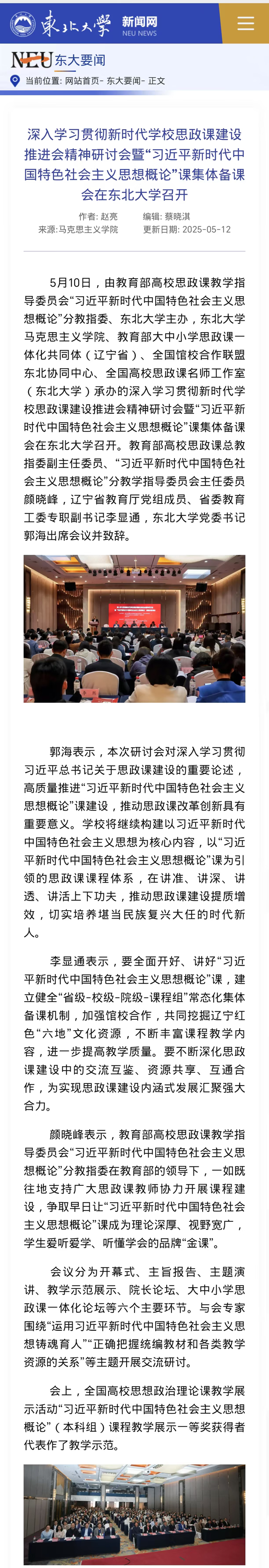 5月10日,由教育部高校思政课教学指导委员会“习近平新时代中国特色社会主义思想概论”分教指委、动漫h 主办,动漫h 、教育部大中小学思政课一体化共同体(辽宁省)、全国馆校合作联盟东北协同中心、全国高校思政课名师工作室(动漫h )承办的深入学习贯彻新时代学校思政课建设推进会精神研讨会暨“习近平新时代中国特色社会主义思想概论”课集体备课会在动漫h 召开。教育部高校思政课总教指委副主任委员、“习近平新时代中国特色社会主义思想概论”分教学指导委员会主任委员颜晓峰,辽宁省教育厅党组成员、省委教育工委专职副书记李显通,动漫h 党委书记郭海出席会议并致辞。