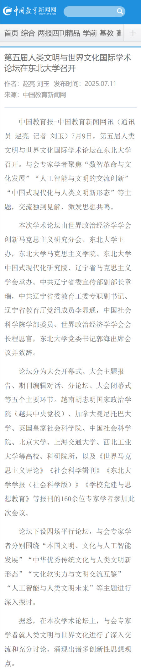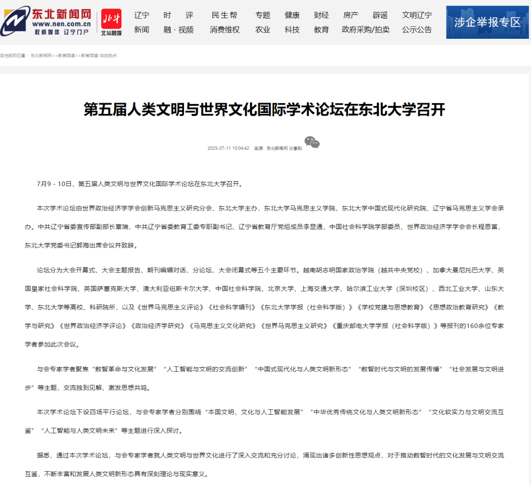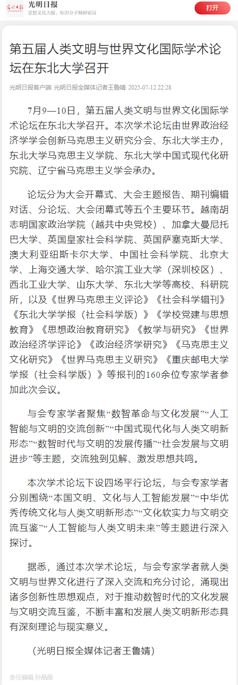 7月9-10日,由世界政治经济学学会创新马克思主义研究分会、动漫h 主办,动漫h 、动漫h 中国式现代化研究院、辽宁省马克思主义学会承办的第五届人类文明与世界文化国际学术论坛顺利举行。本次研讨会受到光明日报、中国教育报等多家主流媒体关注报道。