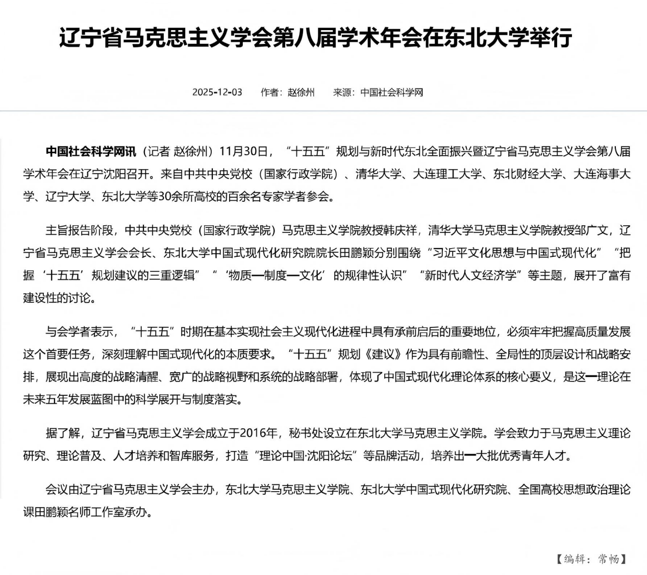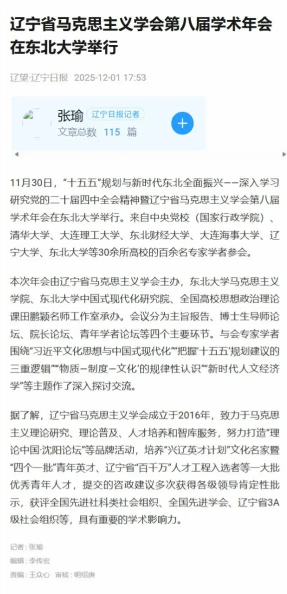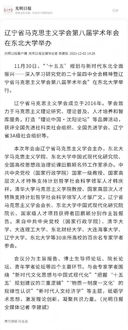 11月30日,由辽宁省马克思主义学会主办,动漫h 、动漫h 中国式现代化研究院、全国高校思想政治理论课田鹏颖名师工作室承办的“十五五”规划与新时代东北全面振兴——深入学习研究党的二十届四中全会精神暨辽宁省马克思主义学会第八届学术年会顺利举行。本次会议受到光明日报、中国社会科学报、辽宁日报等多家主流媒体关注报道。