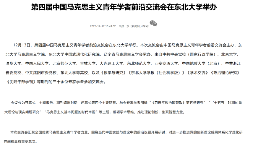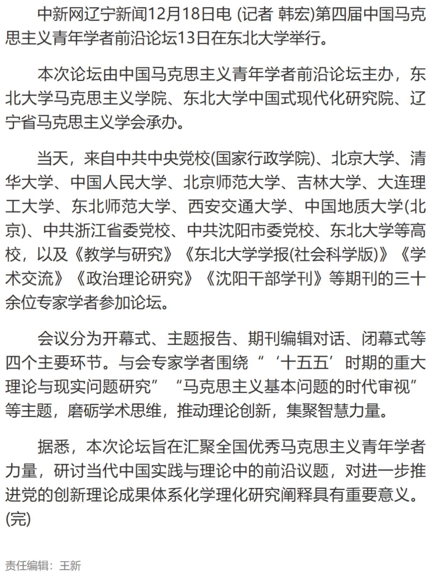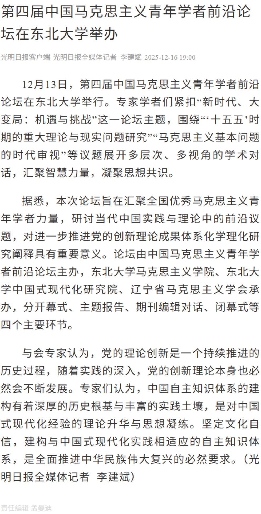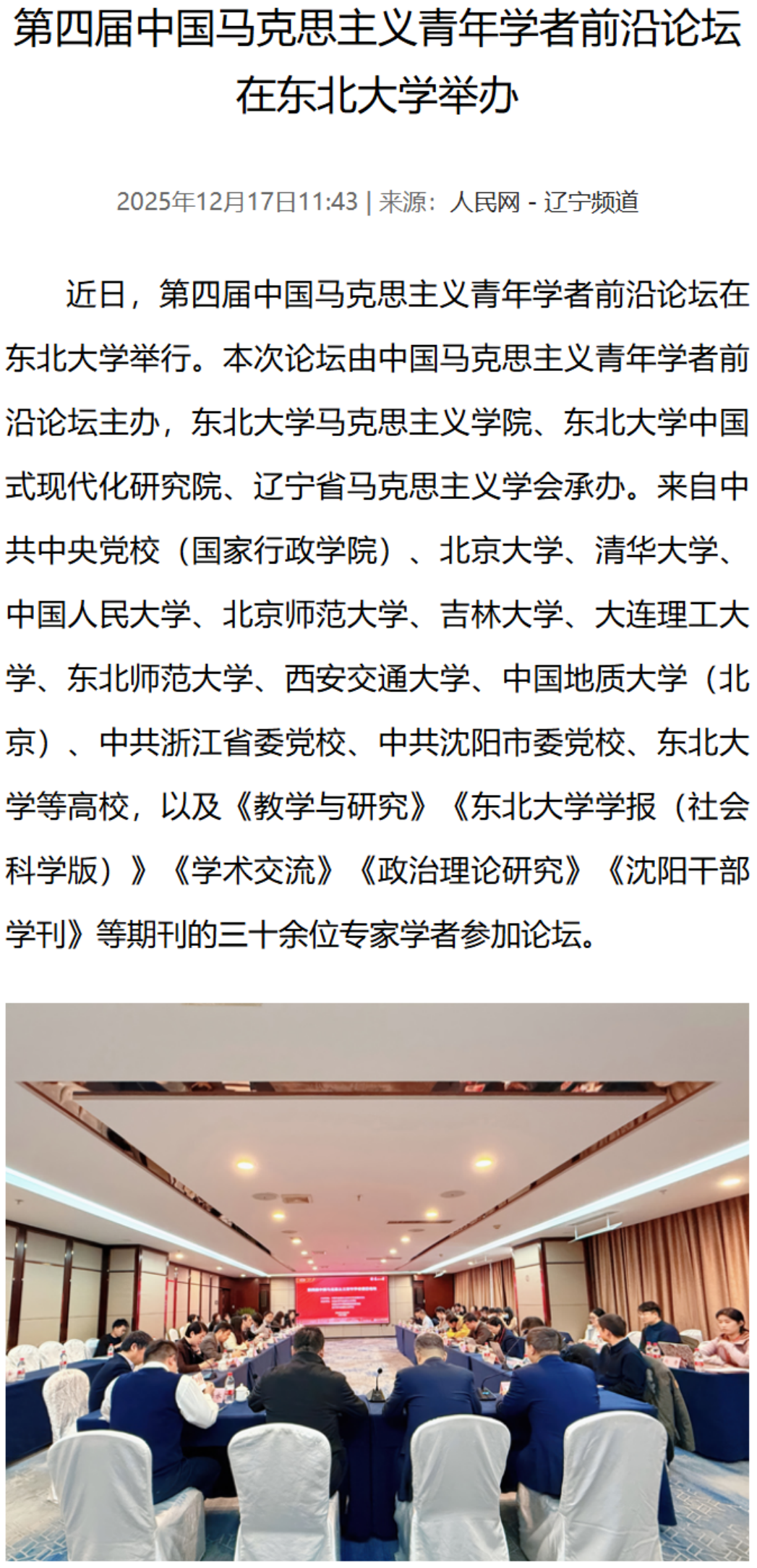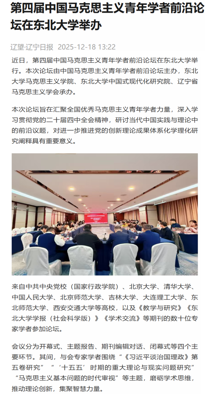 12月13日,由中国马克思主义青年学者前沿论坛主办,动漫h 、动漫h 中国式现代化研究院、辽宁省马克思主义学会承办的第四届中国马克思主义青年学者前沿论坛在动漫h 顺利举办。本次论坛受到光明日报、人民网、中新网、东北新闻网、辽宁日报等多家主流媒体关注报道。